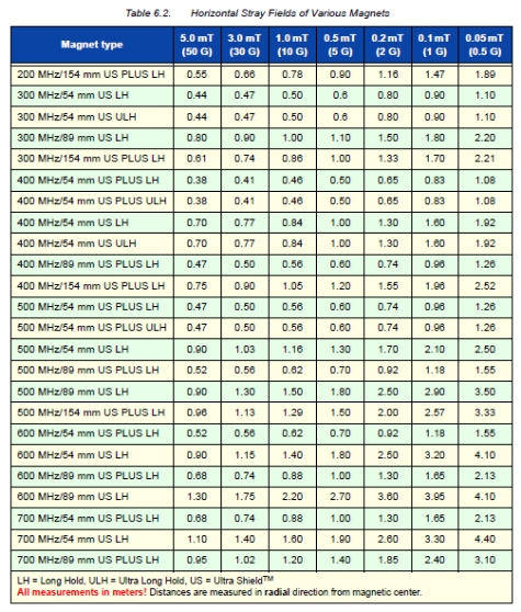 附件:不同场强核磁共振仪器各高斯线对应距离。