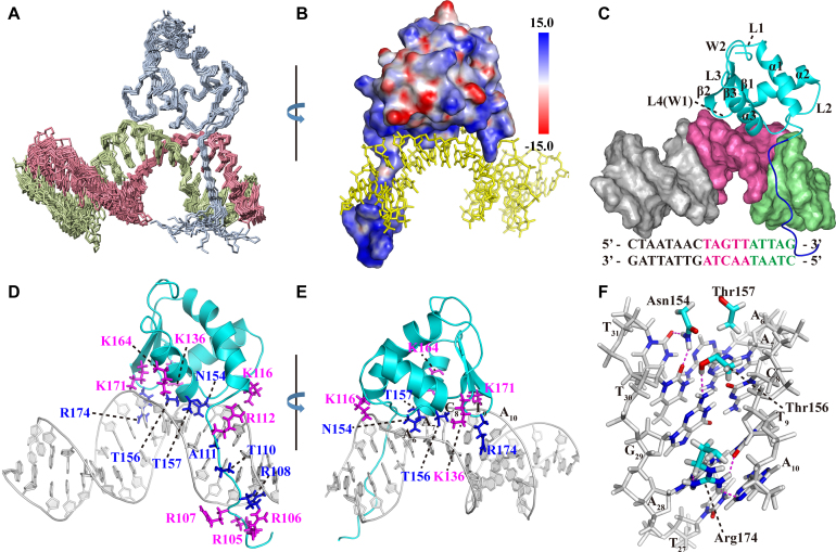Bacterial xenogeneic silencers play important roles in bacterial evolution by recognizing and inhibiting expression from foreign genes acquired through horizontal gene transfer, thereby buffering against potential fitness consequences of their misregulated expression. Here, the detailed DNA binding properties of Rok, a xenogeneic silencer in Bacillus subtilis, was studied using protein binding microarray, and the solution structure of its C-terminal DNA binding domain was determined in complex with DNA. The C-terminal domain of Rok adopts a typical winged helix fold, with a novel DNA recognition mechanism different from other winged helix proteins or xenogeneic silencers. Rok binds the DNA minor groove by forming hydrogen bonds to bases through N154, T156 at the N-terminal of α3 helix and R174 of wing W1, assisted by four lysine residues interacting electrostatically with DNA backbone phosphate groups. These structural features endow Rok with preference towards DNA sequences harboring AACTA, TACTA, and flexible multiple TpA steps, while rigid A-tracts are disfavored. Correspondingly, the Bacillus genomes containing Rok are rich in A-tracts and show a dramatic underrepresentation of AACTA and TACTA, which are significantly enriched in Rok binding regions. These observations suggest that the xenogeneic silencing protein and its resident genome may have evolved cooperatively.